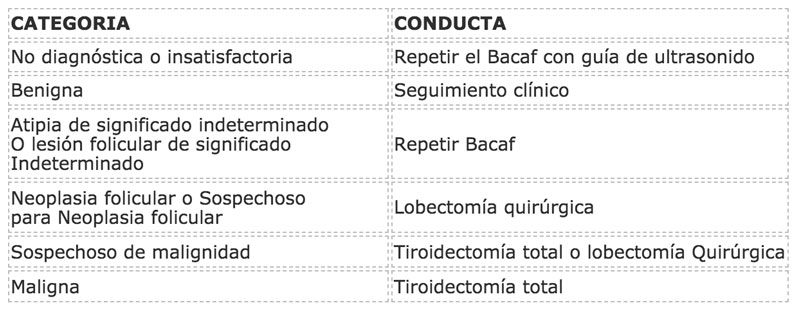 Durante las últimas décadas la citología aspirativa de tiroides (Bacaf) ha ganado gran espacio en el manejo de la Patología tiroidea y se ha convertido en un método esencial, de rutina, sencillo, fácil y de bajo costo para la evaluación de pacientes con nódulos tiroideos, el cual selecciona a pacientes con mayor riesgo de tener lesiones malignas y brinda una gran ayuda y orientación a los clínicos acerca de cuál es la mejor manera de manejar dichos pacientes, contribuyendo a reducir el número de cirugías, muchas de las cuales se consideran innecesarias en el manejo de pacientes con este tipo de Patología.